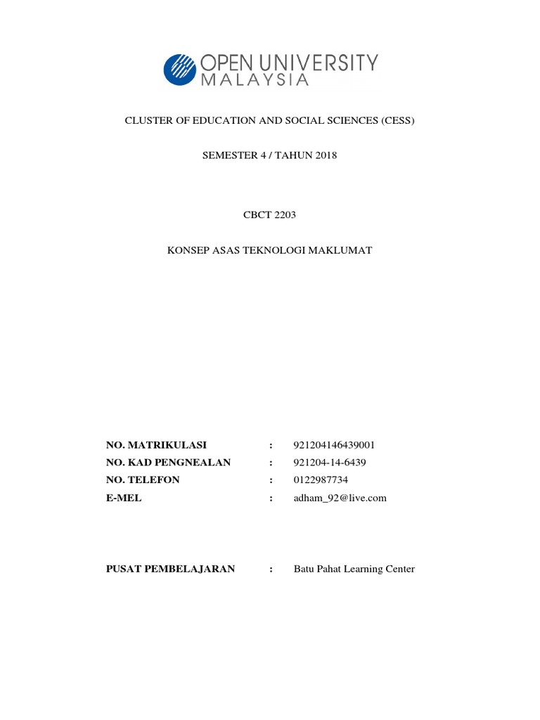 PENGENALAN CBCT2203 Konsep Asas Teknologi Maklumat ialah salah satu daripada kursus yang ditawarkan oleh Fakulti Teknologi Maklumat dan Komunikasi Multimedia di Open University Malaysia OUM. Pengguna mahukan perisian perkakasan dan kemahiran komputer yang sepadan. CBCT2203 Konsep Asas Teknologi Maklumat eApr M.