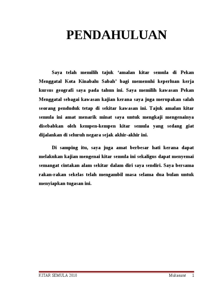 Program kitar semula dapat mengurangkan kuantiti sampah kerana bahan buangan seperti surat khabar botol minuman dan besi boleh dikitar semula dan diproses menjadi bahan mentah untuk kegunaan pelbagai industri. STRATEGI PELAKSANAAN1 Mengadakan taklimat ringkas berkaitan dengan kitar semula kepada semua murid semasa gerak gempur pagi2 Memaparkan maklumat tentang pencemaran alam sekitar dan risalahrisalah tentang. Dengan Kitar Semula tin aluminium kita akan menjimatkan cukup tenaga untuk menghidupkan televisyen selama 3 jam.