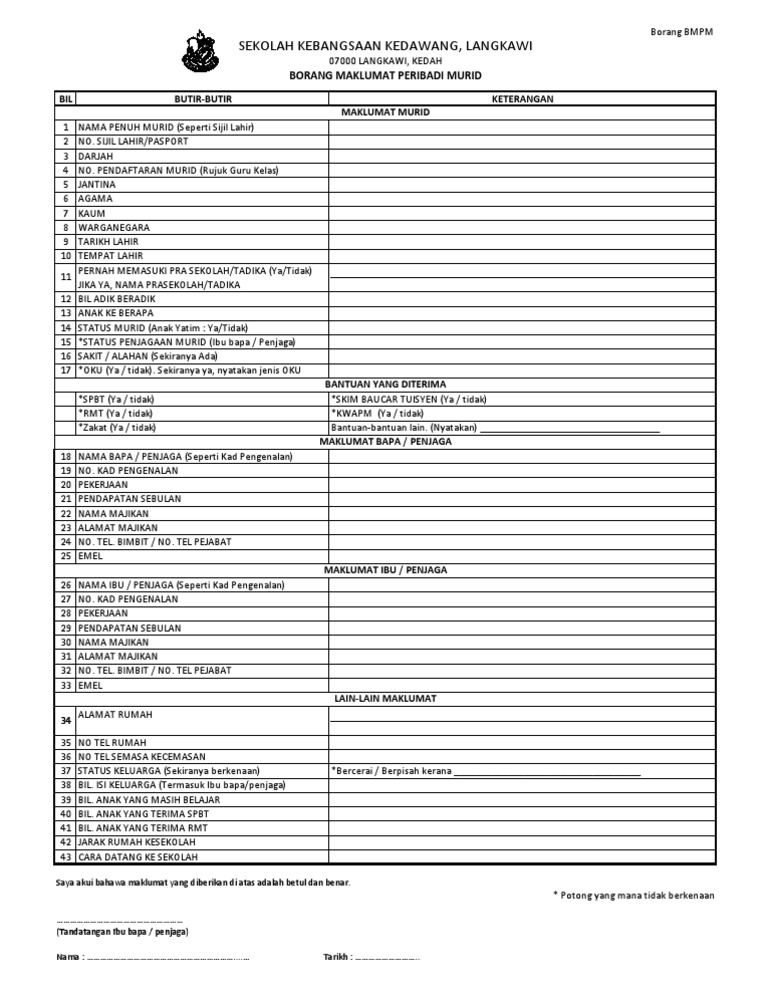 Ianya dapat memudahkan permohonan murid ke Tahun 1 tanpa ibu bapa mengisi borang secara manual. Muat Turun Borang Maklumat Murid Versi APDM. Borang maklumat murid 2.